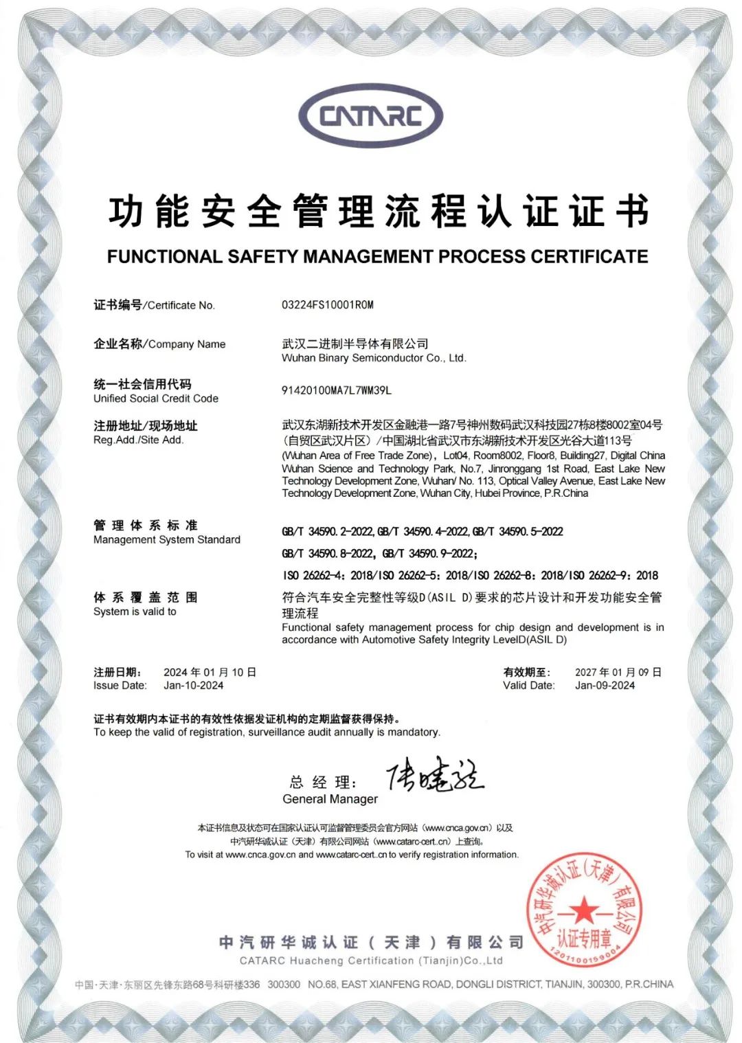 中汽软测助力二进制半导体荣获ISO 26262 ASIL-D 功能安全流程认证证书